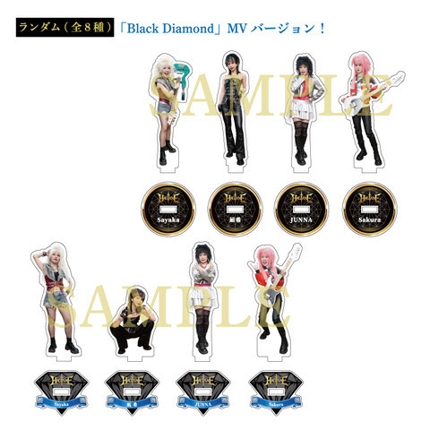 上段:凪希 / 約H10cm×W2.8cm、Sakura / 約H10cm×W5.5cm、Sayaka / 約H9.8cm×W3.6cm、JUNNA / 約H9.8cm×W3.5cm、台座(4種共通) / 約H4.5cm×W4.5cm
